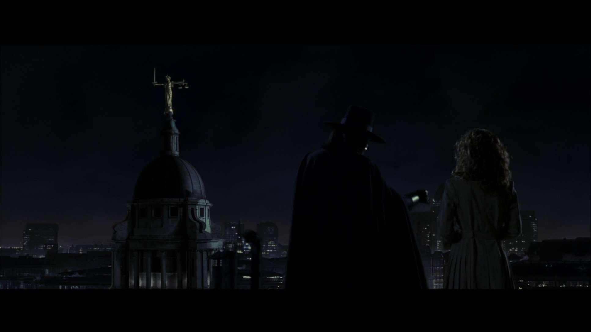 After saving her from the "fingermen" he blows up the Old Bailey after a speech directed at the statue of Justice (which is completely ironic in reality as it is here with the fascist regime in control).